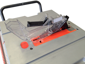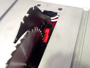 | ブレードガードは独特の形状で、2分割式方式で安全性能を確保。またキックバック防止機能も搭載しております。 | リビングナイフの調整も簡単です。取り外しもレバーひとつで脱着可能です。ブレード平行調整機能が装備しており、4か所のボルトを緩めることでフェンスとの平行調整を行うことが可能です。 | |