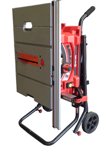 | しっかりとした作りのアルミ製フェンスに可動式フェンスレールを装備しており最大620mmまでカットが可能です。フェンスにはマイクロアジャスト機能を採用しており、切断位置の微調整が簡単に行う事が出来ます。 | スタンドは折り畳み式で省スペースで保管できます。大型のタイヤを装備しているので移動もラクラクです。 | |