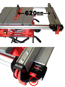 アルミ製テーブルは幅765mmと充分な広さを持ち、右側にエクステンションウイングを装備。エクステンションウイングを拡張する事により最大で620mmまでの切断幅を確保できます。