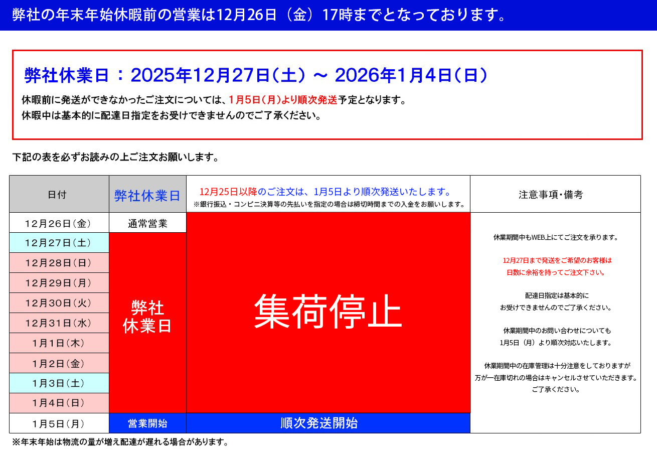 誠に勝手ながら2025年12月27日~2026年1月4日まで年末年始休業とさせていただきます。