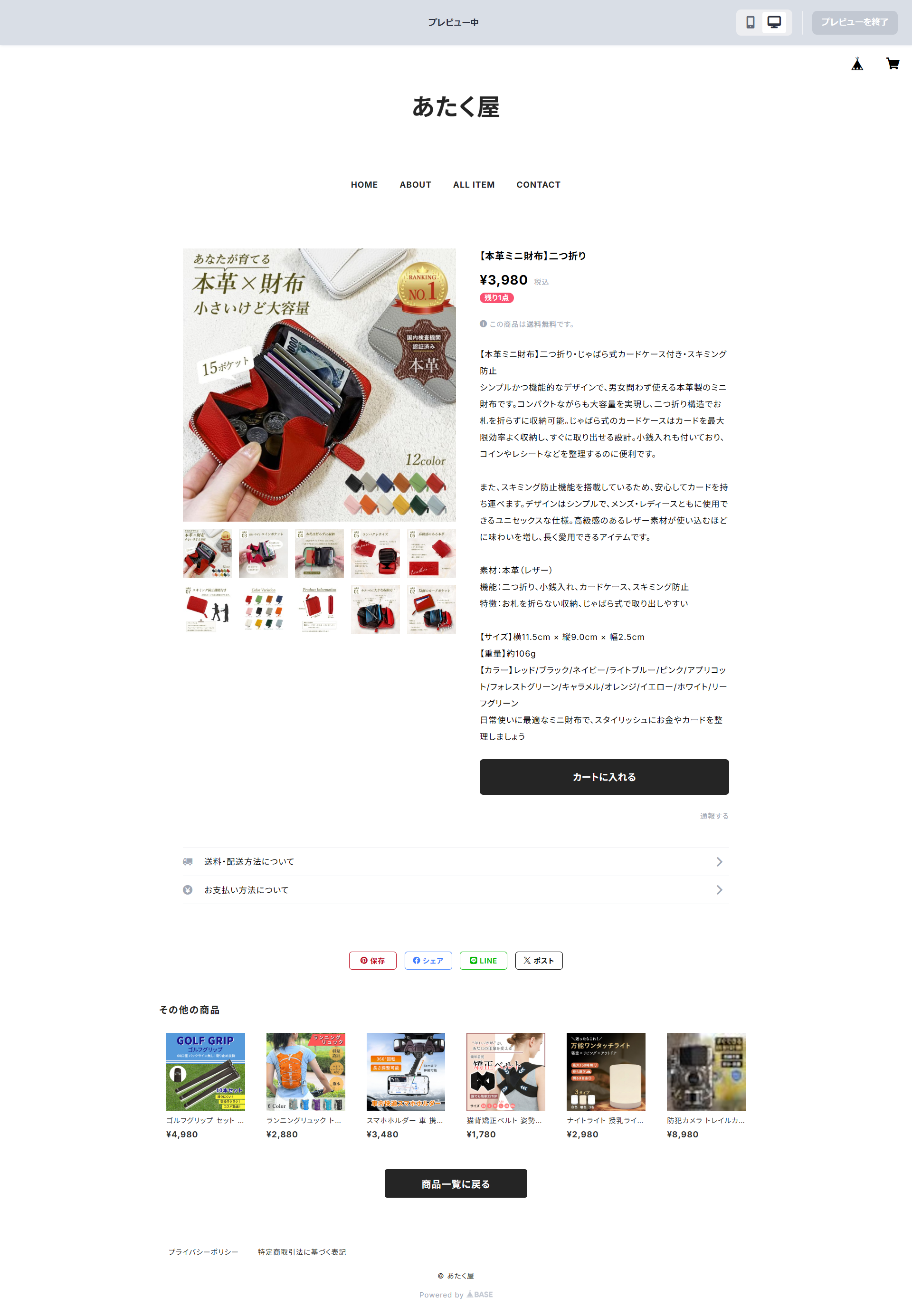 機能:二つ折り、小銭入れ、カードケース、スキミング防止