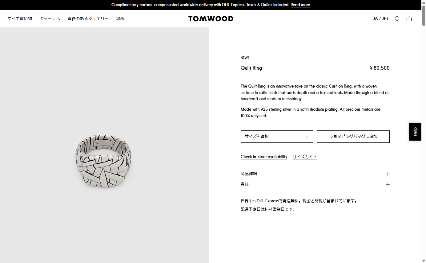 ノルウェー・オスロを拠点にしたジュエリーブランド「TOM WOOD(トムウッド)」。ミニマルでシンプルながら、程よいエッジとエレガントさを残したデザインが魅力。 デザイナーのMONA JENSEN(モナヤンセン)の感性が光るモダンなコレクションは世界中のファッショニスタから支持を得ています。「キルトリング」は職人の手で1点ずつ織り込んだキルトデザインを3Dスキャンし、繊細なディテールはそのままにデジタル技法で仕上げた、手作業と最新技術の融合により誕生したリングです。トムウッドらしいミニマルなフォルムに有機的なニュアンスが加わった、独自の質感とデザインが際立つ魅力的なアイテムです。