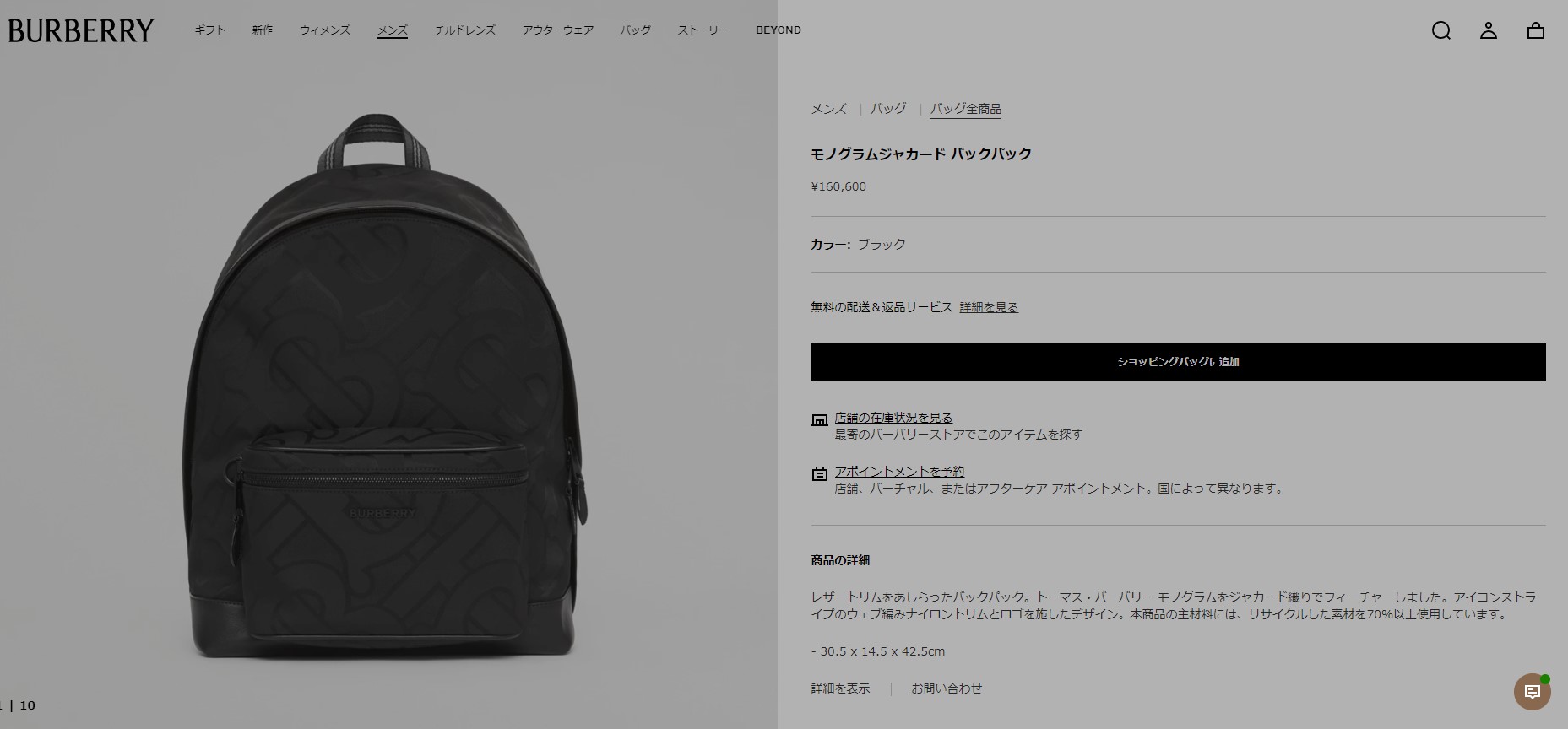 トーマス・バーバリー モノグラムがジャカード織りで施されたバックパック。上質なレザーのトリミングとロゴマークもワントーンで統一され総柄ながら、落ち着いた高級感のあるデザイン。主材料には、リサイクルした素材が70%以上使用され環境にも配慮した一品。大容量のメインコンパートメントに加え内外にファスナーポケットなどを備えた使い勝手の良さも魅力です。シンプルでカジュアルなデザインは、タウンユースやレジャーなど幅広いシーンで活躍してくれそう。