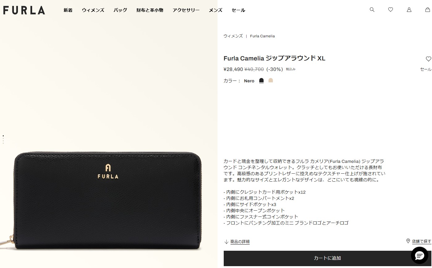 ファスナー式開閉 / 内側:札入れ×3、カードポケット×12、オープンポケット×3、ファスナー式小銭入れ×1