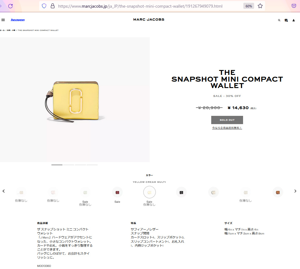 並行輸入 マークジェイコブス 2つ折り財布 MARC JACOBS スナップショット M0013360 745レディース イエロー 黄 ライトベージュ