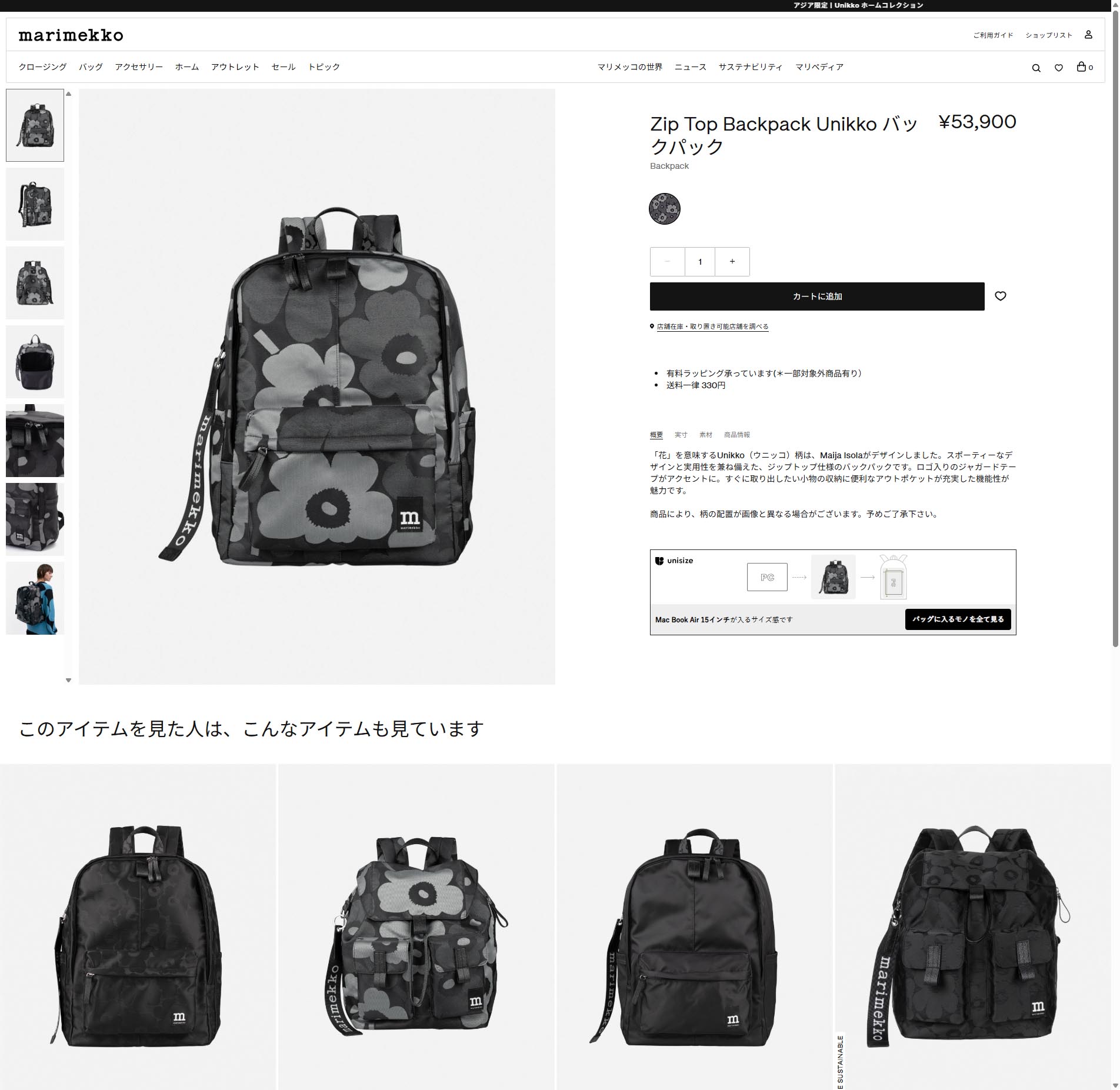 並行輸入 マリメッコ リュックサック ウニッコ ZIP TOP BACKPACK 094809 990