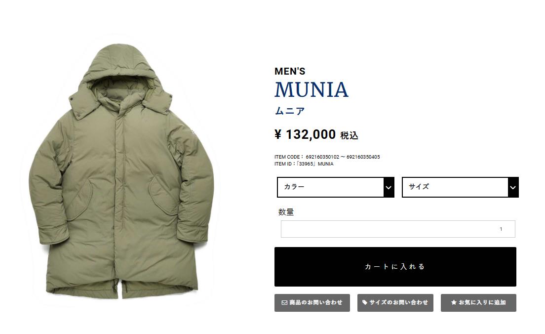 軍用の極寒用野戦パーカー「フィッシュテールパーカー」をモチーフにしたミリタリーテイストのダウンコート「ムニア」。マットな質感のリサイクルナイロン製素材に、長めの後身頃に傾斜をつけたヘムと、ゆとりのある身幅のリラックスしたフォルムが大人の抜け感を演出します。ロフト感のあるフレンチダックダウンを採用し、リブカフの袖口で冷風の侵入を防ぎ、防寒性に優れているのも嬉しいポイント。シンプルなフォルムに遊び心のあるアクセントや高い機能性で、タウンユースにマッチする1枚です。
