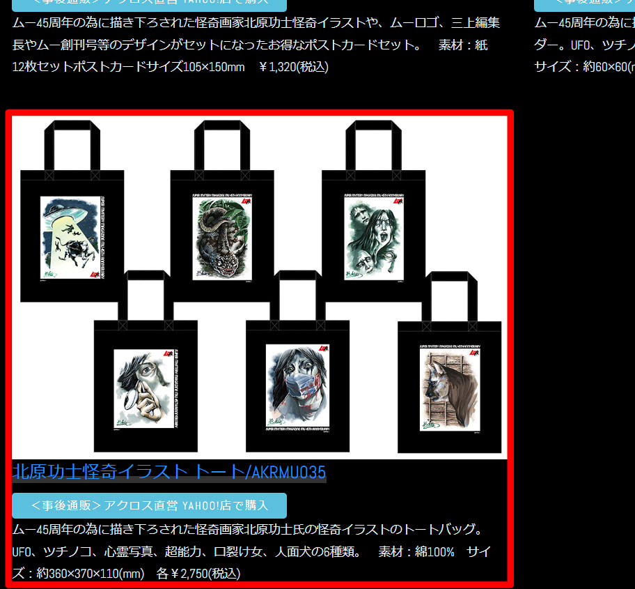【40%OFF】月刊ムー グッズ 公式 創刊45周年 北原功士 怪奇イラスト トートバッグ 全6種