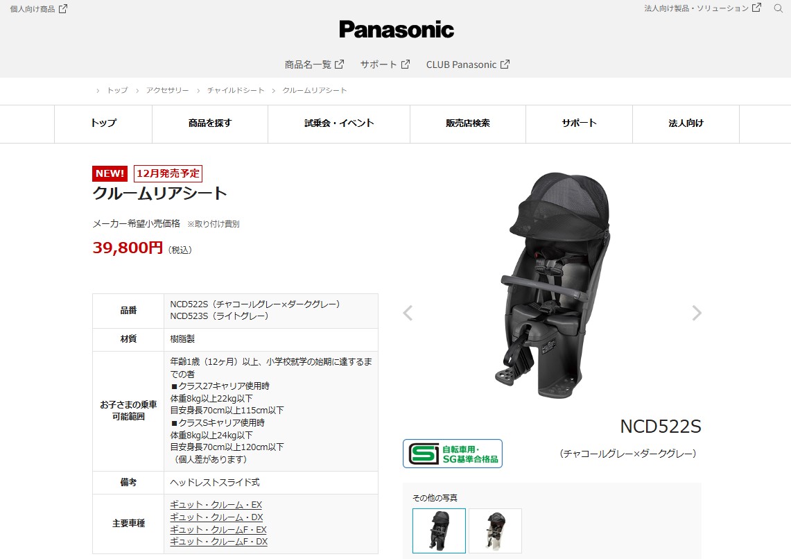 クルームリアシート 自転車 チャイルドシート Panasonic ギュットクルーム NCD522S/NCD523S 後ろ 子乗せ チャコールグレー×ダークグレー ライトグレー