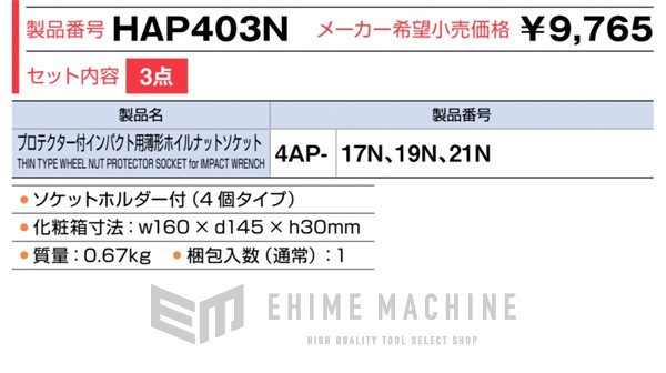 プロテクター付きインパクト用薄型ホイルナットソケット:4AP-17N、4AP-19N、4AP-21N、ソケットホルダ