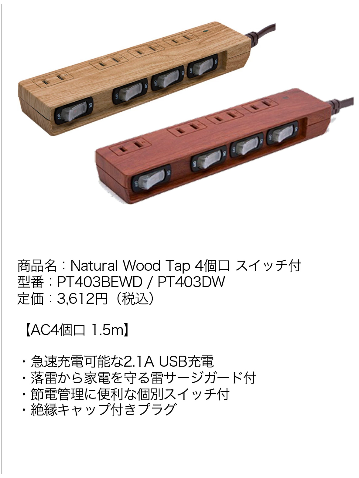 商品名:Natural Wood Tap(ナチュラルウッドタップ)AC4個口 スイッチ付定格容量:15A・100〜125V (1,500Wまで) <br>
