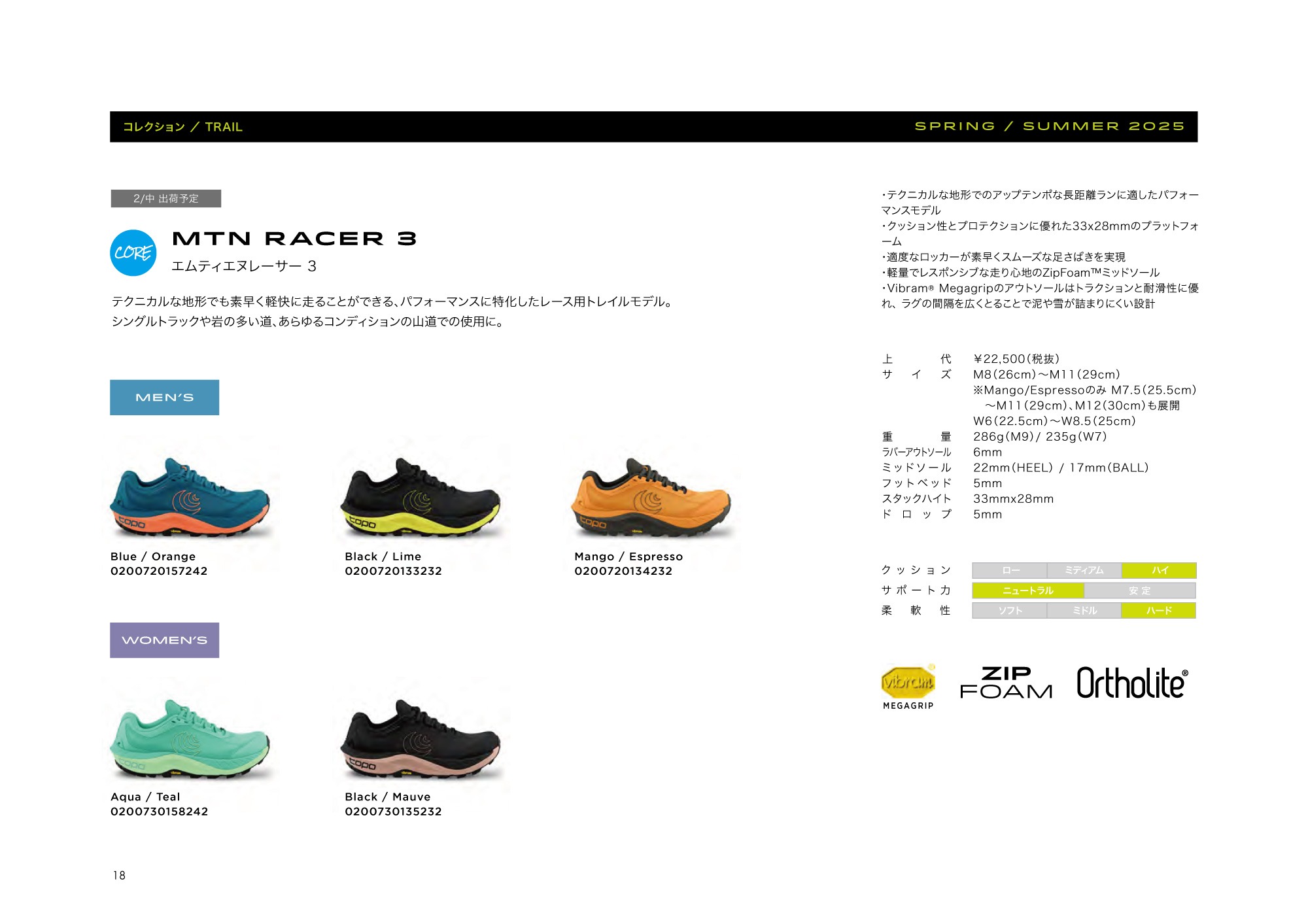 MTN RACER 3はテクニカルなトレイルに最適です。スタックハイトを前作の30mm×25mmから33mm×28mmへ変更したことで、クッション性と保護性能が向上しました。また、改良されたつま先のスイープが、素早い歩行サイクルの動きと、スムーズな走りをサポートします。ミッドソールには新しい配合のZipfoamを使用しており、ソフトなクッショニングと高い反応性を兼ね備えています。多くのファンを持つVibramメガグリップアウトソールは、不安定な路面でも本格的なトラクションとグリップ力を発揮します。
