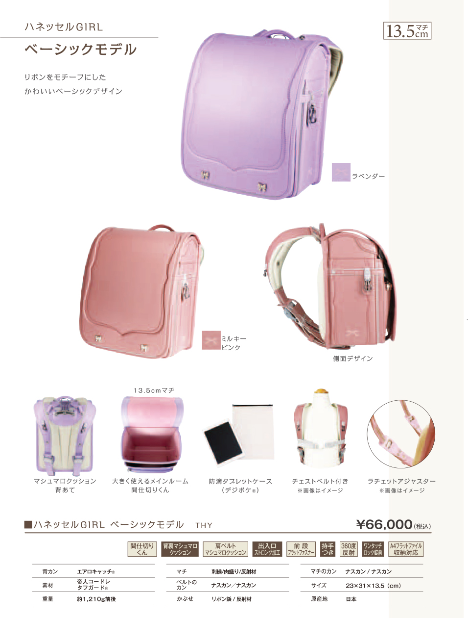 ランドセル ハネッセル GIRL ベーシック A4フラットファイル対応 ラチェットアジャスター カバー付き 大容量 軽い 軽量 360度反射 女の子 6年保証