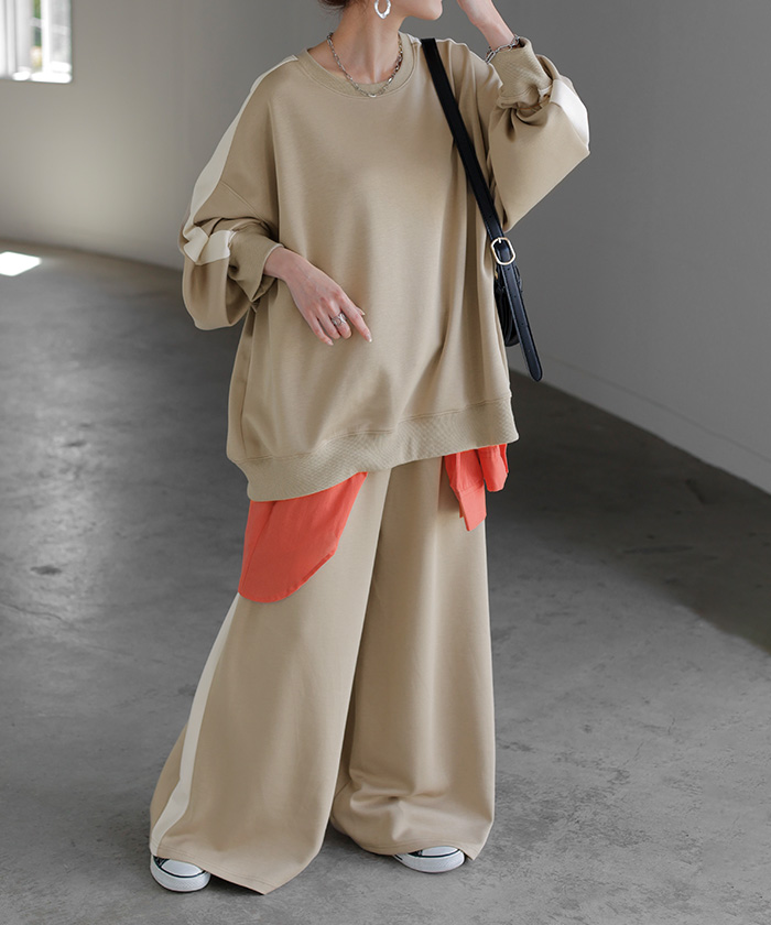 セットアップ トップス ボトムス チュニック ロング オーバー ライン 長袖 長い ワイド ワイドパンツ 2点セット