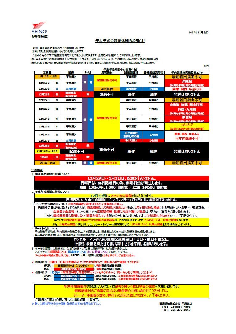 誠に勝手ながら12月27日(土)~1月4日(日)はお休みとさせていただきます。何かとご不便をお掛け致しますが、1月5日(月)から営業となりますので、商品の発送準備業務・商品の発送業務・ご質問回答業務等は、休み明けに順次行わせて頂きます。 - 【配送日指定に関しまして】