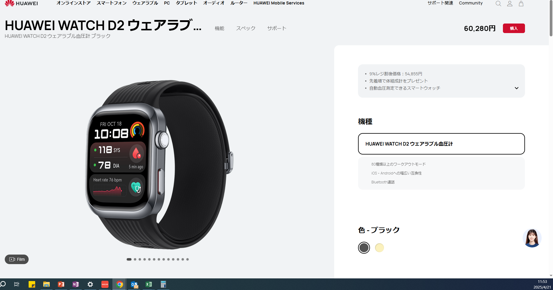 【体重計同梱】スマートウォッチ HUAWEI WATCH D2 ファーウェイ 自動血圧測定 心電図ECG ポンプとエアバッグ搭載 心拍数 血中酸素 一週間 IP68防水