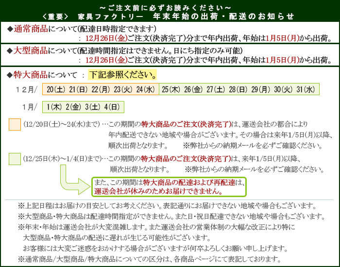 【大型商品】日曜/祝日の配達ができない地域がございます(再配達も同様)