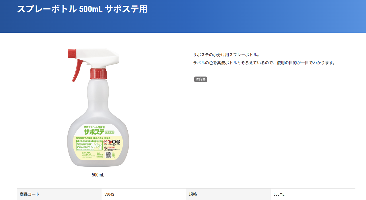 サラヤ サポステ用スプレーボトル 500ml 空ボトル SARAYA 4987696530423/53042/