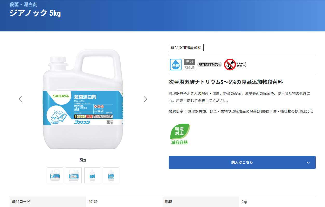 サラヤ ジアノック 5kg 殺菌・漂白剤 食品添加物殺菌料 次亜塩素酸ナトリウム SARAYA 4987696401396/40139