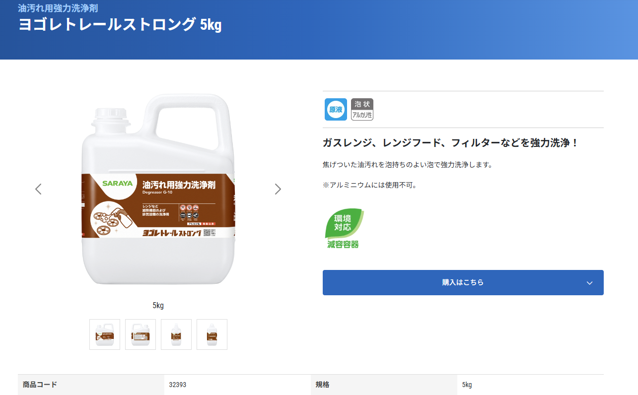サラヤさんのヨゴレトレールは、私が知ってる限りでは一番ヨゴレが取れる洗剤です。しつこい油ヨゴレは、安心して掃除ができます。リピーターです。まとめ買いをしました。是非使ってみてください。油汚れには、ヨゴレトレール名前のとおりです。