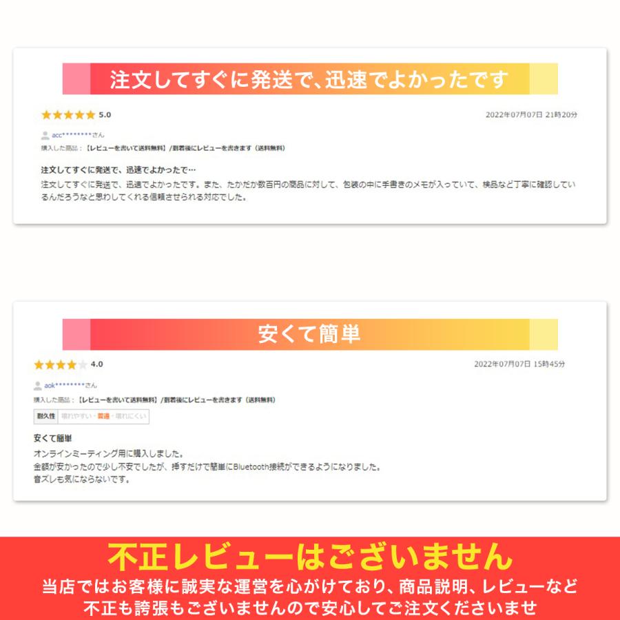 注文・発送・到着、スムーズで早かったです。ただ到着した商品が初期不良で使用できず(複数Windows10PCで検証)。注文履歴詳細の『注文に関する問い合わせ』より状況を2回連絡したところ、代替品をすぐに送ってもらえました。再送された商品はUSB端子に挿してすぐ認識して、BT機器のペアリングも問題なく出来ました。数種のBTイヤホンを切り替えながら・キーボード・マウスを接続して1週間ほど使っていますが特に問題は出てません。通信距離は自分の使用環境だと5~6mでBTイヤホンが途切れはじめますが十分な性能と思ってます。耐久性はこれからなので普通にしておきます。価格が安い商品ですが、手持ちの1~2000円前後のBTアダプタと性能は大差ないと感じました。初期不良は目視で分からないので、Laundlyさん・私とも不運でしたが、その後の対応は素晴らしく温かいものでした。感想を書くにあたりLaundlyさんのショップバナーを見て気づいた事、『買ってよかった♪を届けたい』の記載。誠意・誠実・安心・満足を体験し、十分に届いた自分としては偽りなく実践していると思い、安心してリピート出来るお店と感じました。