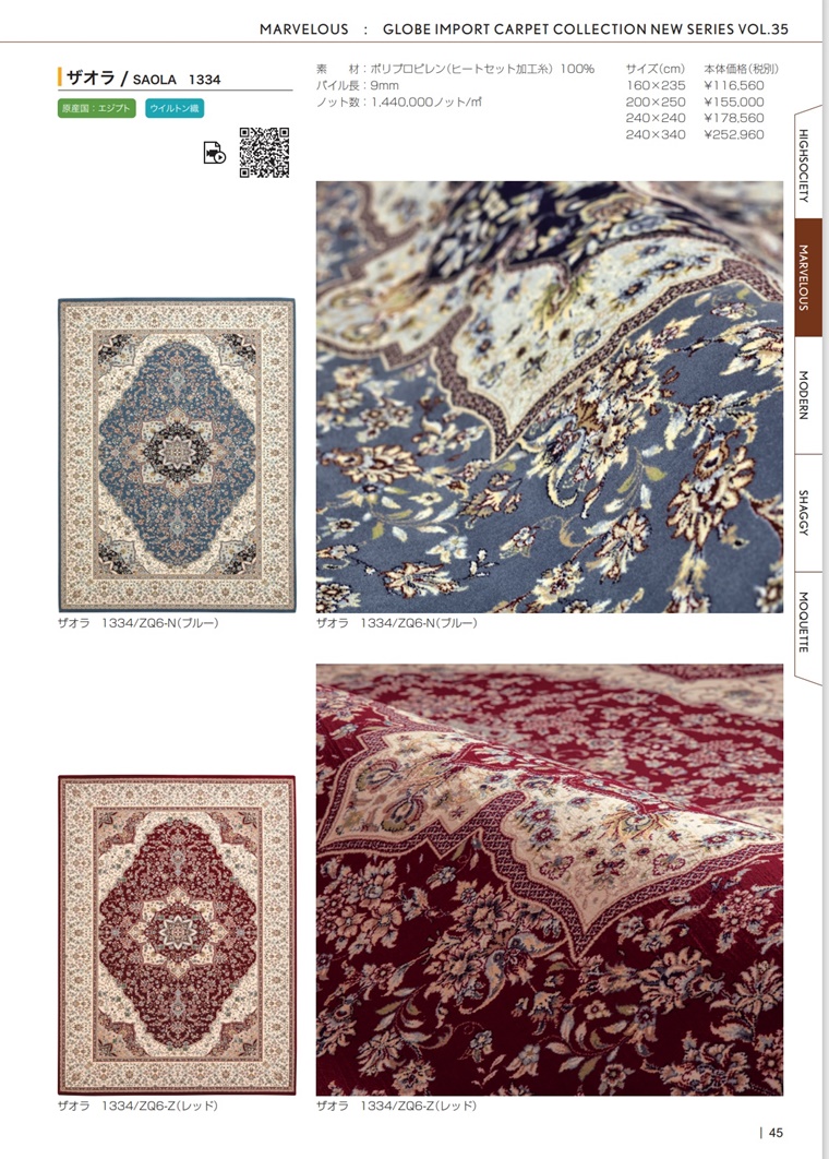 144万ノットと言う超高密度な織。デザインも細かく、くっきりと表現され、アラベスクの曲線もなめらかで美しく、上品でエレガント満足のいく踏み心地で、耐久力も抜群です。