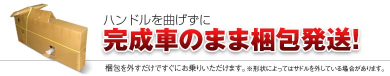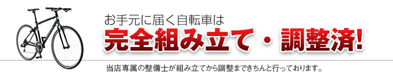 当店でご購入頂いたすべての自転車・スポーツバイクは、技術講習を受けた確かな経験を持ったスタッフにより調整・点検を施されております。 自転車は、完全組み立て・ 調整・がっちり梱包でお届けいたします。 バイクと同時購入のパーツはお取り付けして発送いたします。 お客様は梱包を外して頂くだけですぐにご使用頂けます 。 ※自転車の種類によっては梱包時にサドルや、壊れやすいパーツは外してお送りする場合があります。