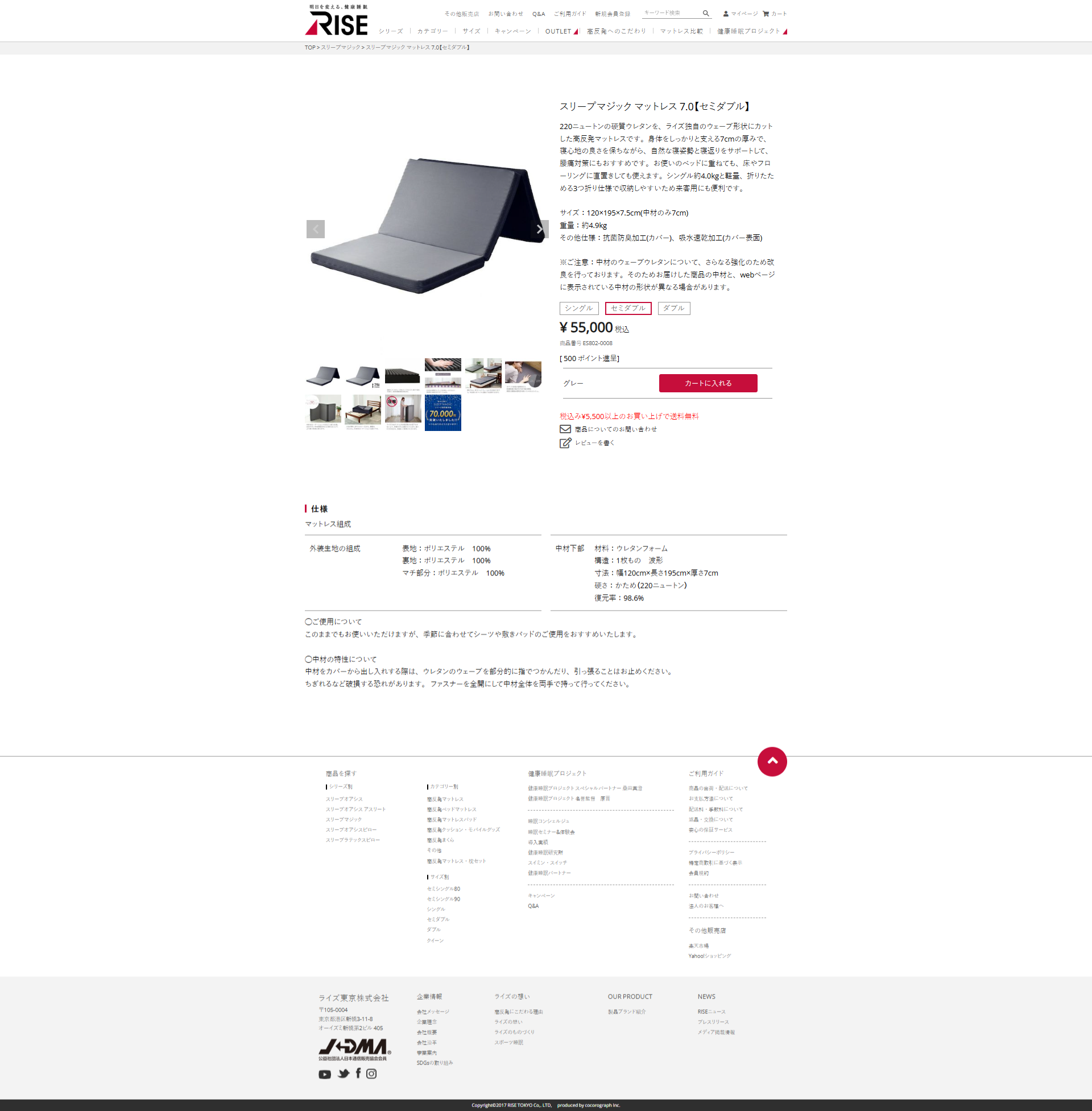 高反発マットレス 7.0 セミダブル スリープマジック 7cm マットレス 折りたたみ 三つ折り ライズ東京 高反発 体圧分散 腰痛対策 RISE