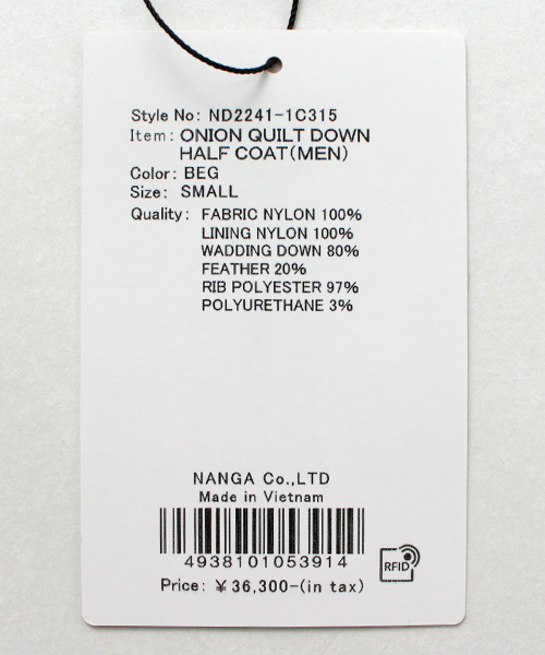 NANGA(ナンガ) オニオンキルト ダウン ハーフコート アウター メンズ レディース ユニセックス アウトドア