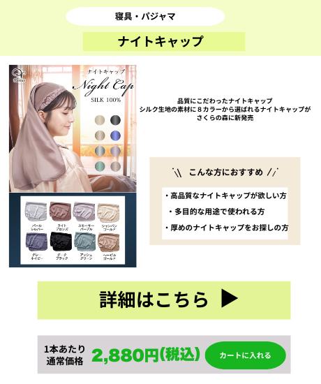 さくらの森 ナイトキャップ シルク シルクナイトキャップ ショートヘア ロングヘア ショート ロング シルク100% レディース メンズ 女性用 就寝用 ヘアケア 睡眠 寝癖防止 保湿 美髪 快眠 パサつき 予防 おしゃれ 枝毛 抜け毛 ダメージケア 癖毛 くせ毛 乾燥 帽子 ギフト プレゼント トリートメント 寝具 フリーサイズ 就寝 パジャマ 可愛い かわいい 保護 ダメージ 髪の毛 ケア うねり 潤い 簡単 ヘアゴム シルク製 静電防止 摩擦 通気性 うるツヤ シルバー ライト ブロンズ パープル ゴールド グレーネイビー ダーク ブラック アッシュ グリーン ナイトキャップ 寝る帽子 睡眠帽子 シルクナイトキャップ コットンナイトキャップ レースナイトキャップ フリルナイトキャップ ストラップナイトキャップ ボンネット 女性用 男性用 子供用 サテン チュール ベロア ウール キャッシュミア アクリル ポリエステル レーヨン ナイロン ポリウレタン ブラック ホワイト グレー ネイビー ピンクレッド イエロー グリーン ブルー パープル フリーサイズ Sサイズ Mサイズ Lサイズ LLサイズ