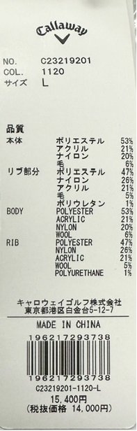 本体 ポリエステル 53% アクリル 21% ナイロン 20% 毛 6% / リブ部分 ポリエステル 47% ナイロン 26% アクリル 21% 毛 5% ポリウレタン 1%