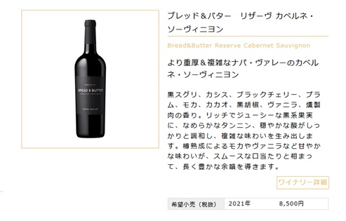 商品名:ブレッド アンド バター リザーブ カベルネ ソーヴィニヨン ナパ ヴァレー